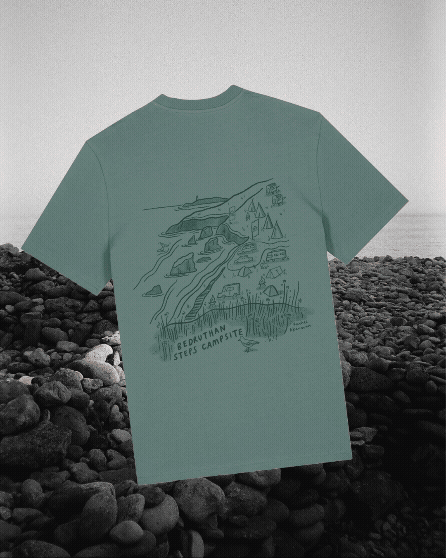I’m excited to share a new illustrated t-shirt design I’ve created for the beautiful Bedruthan Steps Camping—a hidden gem perched high above the cliffs of North Cornwall. With sweeping views of the Atlantic Ocean and the iconic sea stacks below, this relaxed campsite is a dream destination for anyone who loves camping, surf, and exploring the wild Cornish coast.